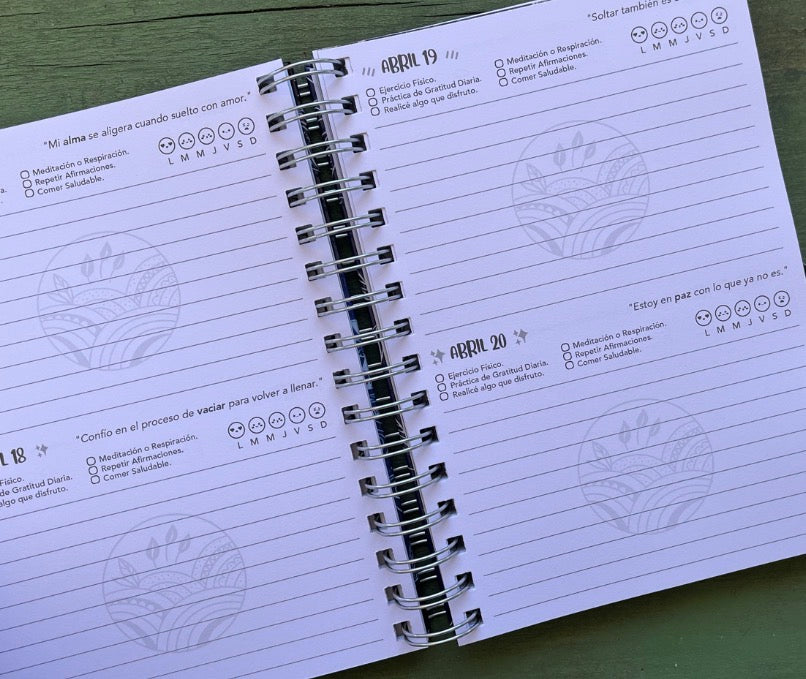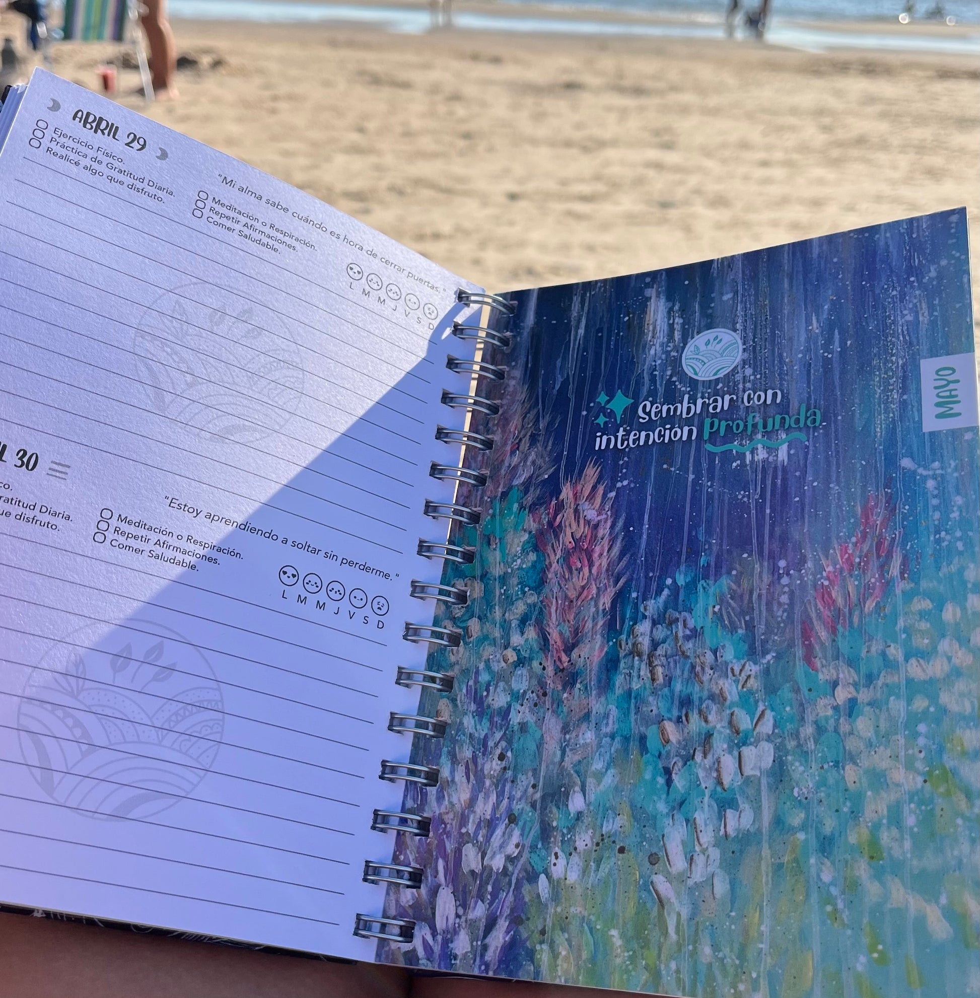 Agenda perpetua interactiva con ejercicios, arte y espacios de reflexión para organizarte, conectar con tu bienestar y acompañar tu crecimiento personal día a día.